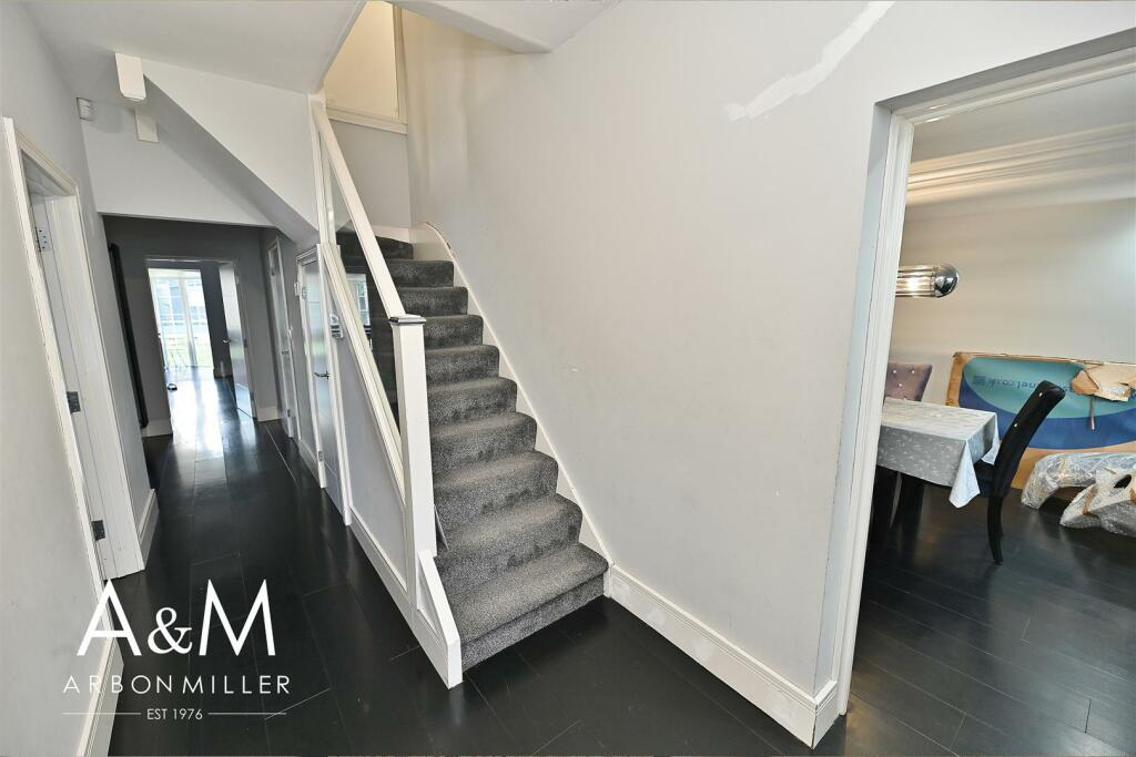 As you enter, you’re welcomed by a grand foyer with vaulted ceilings, leading into a spacious open-concept living area.